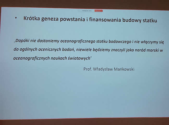 Wykład pt. „Statek badawczy „Profesor Siedlecki” zarys możliwości badawczych i krótka historia udziału statku w badaniach międzynarodowych“ wygłosił prof. Tomasz Linkowski: