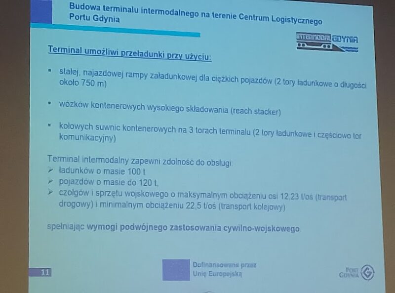 Nowy terminal intermodalny, dofinansowany przez Unię Europejską na poziomie 50 procent kwotą ok. 35 milionów złotych, powstaje na terenie Centrum Logistycznego Portu Gdynia. W ramach projektu powstanie 2,73 km nowych torów kolejowych, 30 tysięcy metrów kwadratowych placów manewrowych oraz stacjonarna rampa przeładunkowa umożliwiająca obsługę ciężkich pojazdów cywilnych i wojskowych.