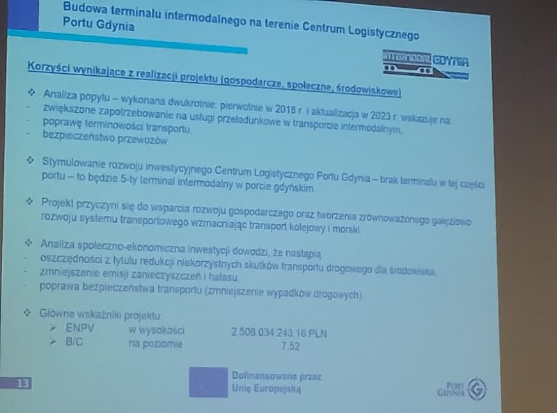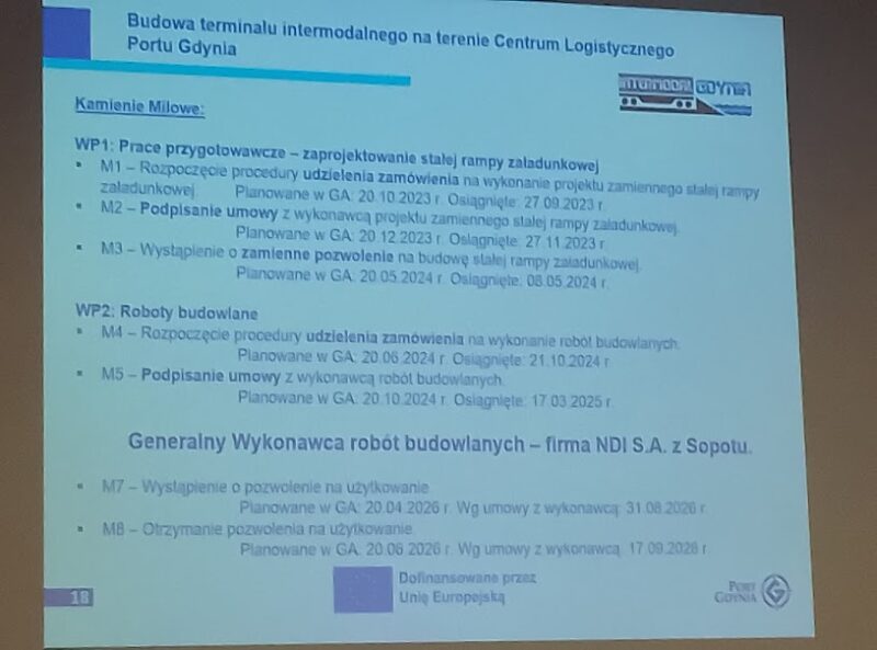 Budowa terminalu potrwa do drugiej połowy 2026 roku. Po jej zakończeniu Port Gdynia zyska nowoczesną infrastrukturę, która odciąży drogi, zwiększy udział kolei w transporcie towarów, poprawi warunki obsługi ładunków i podniesie strategiczne znaczenie Gdyni w systemie europejskiej logistyki. Projekt „Budowa terminalu intermodalnego na terenie Centrum Logistycznego Portu Gdynia” jest współfinansowany ze środków Unii Europejskiej w ramach instrumentu „Łącząc Europę” (CEF) – napisała Kalina Gierblińska – specjalista – rzecznik prasowy, Biuro Strategii i Analiz Rynkowych Zarządu Morskiego Portu Gdynia S.A.