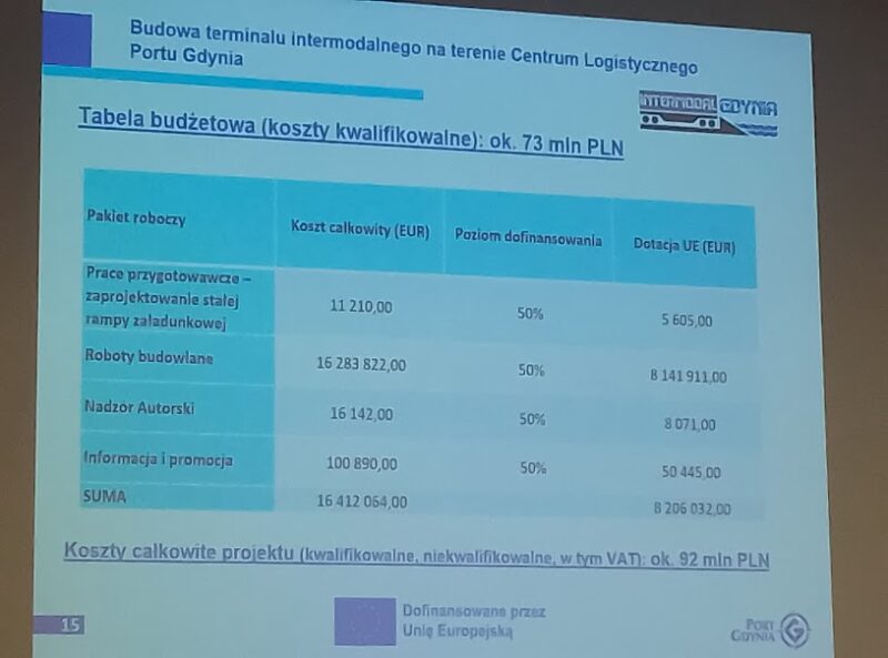 Dofinansowanie: około 8,2 mln euro, właściwie prawie połowa kwoty, którą musimy na ten projekt przeznaczyć. Oczywiście projekt musi się wpisywać w komponent dual use. Pozwoli na zwiększenie możliwości przeładunkowych zarówno cywilnych jak i wojskowych.