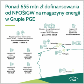 Ponad 655 mln zł dofinansowania od NFOŚiGW na magazyny energii w Grupie PGE. Wsparcie przeznaczono na budowy obiektów: Żarnowiec, Pelplin, Ścieki, Lotnisko i Wojciechowo w woj. łódzkim i pomorskim