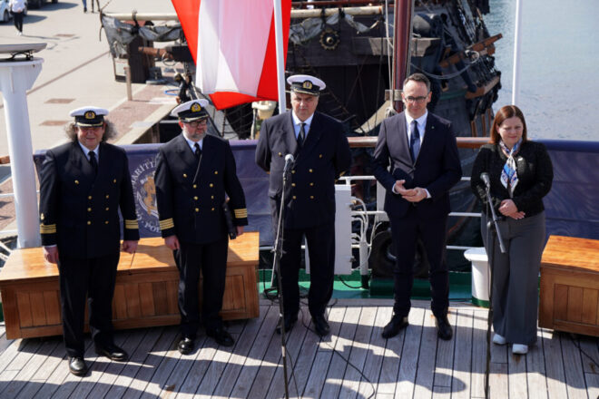Podczas uroczystości Minister Infrastruktury, Dariusz Klimczak, przekazał na ręce JM Rektora prof. dr. hab. inż. kpt. ż. w. Adama Weintrita księgę pamiątkową rejsu, jako symboliczny gest upamiętniający rozpoczęcie wyprawy oraz międzynarodową rangę wydarzenia.