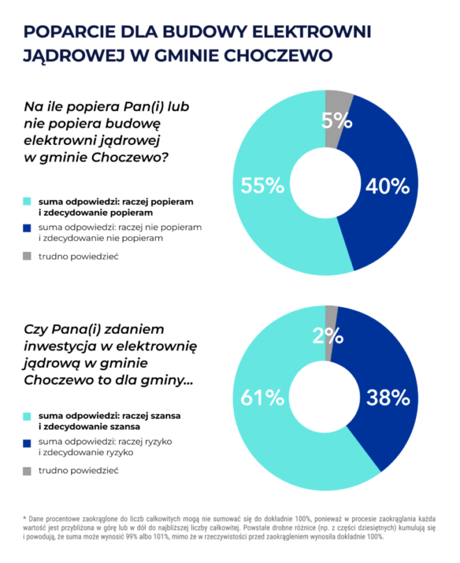 Mieszkańcy gminy Choczewo wśród zalet związanych z miejscem zamieszkania najczęściej wskazują bliskość morza (71 proc.), naturę (60 proc.) i spokój (44 proc.). Wzmożony ruch pojazdów i maszyn, który mogli zaobserwować w ostatnich miesiącach, mógł negatywnie oddziaływać na ich percepcję projektu jądrowego. Wśród obaw związanych z budową elektrowni jądrowej mieszkańcy gminy Choczewo najczęściej wymieniają: pogorszenie jakości życia spowodowane uciążliwościami związanymi z budową elektrowni (38 proc.), obniżenie atrakcyjności turystycznej (29 proc.), oddziaływanie inwestycji na środowisko (28 proc.). – To zupełnie naturalne postawy, wynikające z potrzeby bezpieczeństwa i poczucia komfortu każdego z nas. Nasz umysł preferuje to, co przewidywalne, a nieznane może wiązać się z poczuciem braku kontroli – wyjaśnia Anna Szatanowska z agencji badawczej DANAE. Mimo to, w gminie Choczewo poparcie dla budowy elektrowni jądrowej w lokalizacji Lubiatowo-Kopalino zadeklarowało 55 proc. ankietowanych, a w całym powiecie wejherowskim za realizacją inwestycji opowiedziało się 62 proc. respondentów.