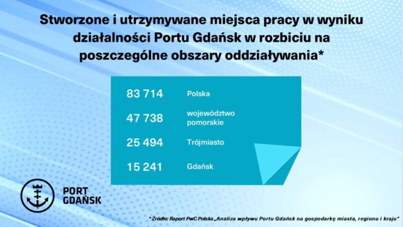 Rzeczywisty wpływ Portu Gdańsk na zatrudnienie jest jednak znacznie większy niż liczba osób pracujących bezpośrednio w porcie. Jego działalność stymuluje popyt na inne usługi, w tym transport, co generuje kolejne miejsca pracy. W 2024 roku działalność Portu Gdańsk wygenerowała łącznie 83,7 tys. miejsc pracy w całej gospodarce narodowej. Oznacza to, że co trzecie miejsce pracy powiązane z działalnością portu powstaje poza jego bezpośrednim otoczeniem. Co więcej, aż 5,7 proc. wszystkich pracujących w województwie pomorskim jest związanych z działalnością Portu Gdańsk – to co dwudzieste miejsce pracy w regionie.