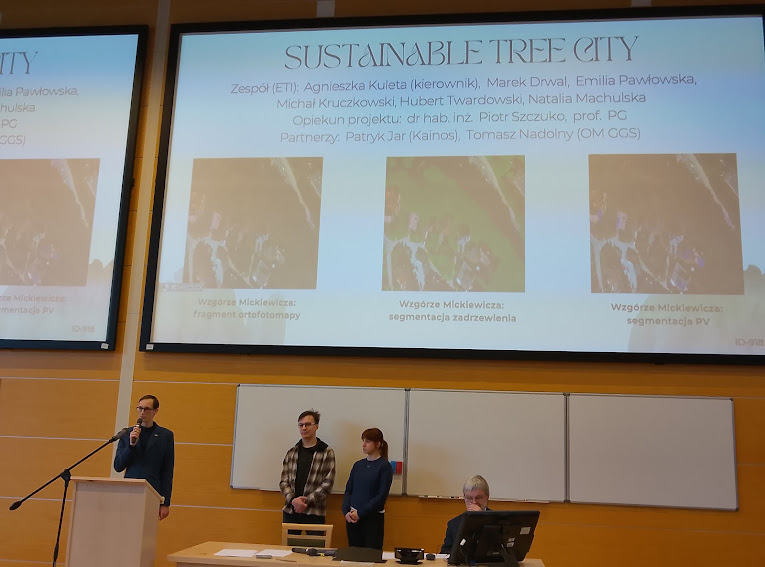 gdzie najnowsza technologia wypracowana przez studentów PG: „Sustainable Tree City“ umożliwia sprawdzanie czy wskutek montażu paneli słonecznych nie ubywa drzew, czy nie są wycinane – po to, by zrobić miejsce na elektrownię słoneczną.