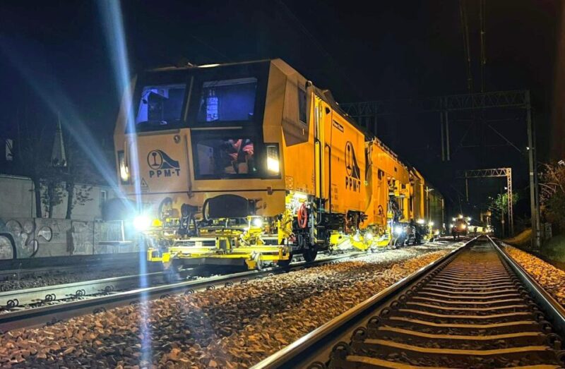 Na zdjęciu: Podbijarka pracuje na torze w nocy. Fot. PPMT.