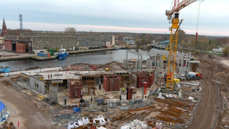 Na terenie budowy bazy operacyjno-serwisowej w Porcie Ustka prace postępują zgodnie z harmonogramem. Generalny Wykonawca zakończył już prace fundamentowe dla budynku biurowo-socjalnego i części magazynowej. Prace budowlane, związane ze wznoszeniem konstrukcji żelbetowych parteru, są na ukończeniu. Na budynku socjalno-biurowym rozpoczął się montaż płyt stropowych nad poziomem parteru. Wykonano także betonowanie pierwszej sekcji stropu nad poziomem 0. W listopadzie na terenie hali magazynowej na prefabrykowanych słupach żelbetowych zamontowano dźwigary strunobetonowe wieńczące konstrukcję hali magazynowej.