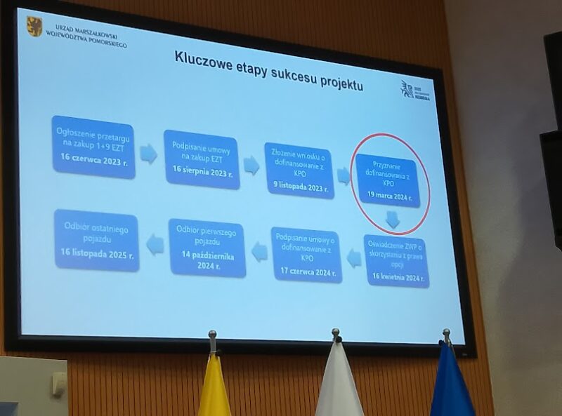 Dzisiaj, podczas konferencji podsumowującej projekt zakupu taboru kolejowego za pieniądze z Krajowego Planu Odbudowy, państwo też dajecie swoją obecnością świadectwo, że zakup o którym mówiliśmy kilka miesięcy wcześniej 10 elektrycznych zespołów trakcyjnych w celu poprawy dostępności transportowej mieszkańców województwa pomorskiego, w szczególności w obszarze aglomeracji trójmiejskiej, został sfinansowany z Krajowego Planu Odbudowy. Jeśli ktokolwiek chciałby powiedzieć, że KPO to jest jakaś mrzonka, że to tylko s ą liczby wypisane albo wypowiadane przez polityków krajowych zwłaszcza koalicji rządzącej to się grubo myli. Mamy tutaj konkrety. Te konkrety polegają na tym, że uzyskaliśmy z KPO ponad 236 milionów złotych dofinansowania, co stanowi 84 procent wydatków projektu. Pozostałe pieniądze czyli 16 procent samorząd województwa wyłoży z własnego budżetu województwa. Po drugie chcę powiedzieć o tym, że pierwszy z nowych pojazdów trafił już do ruchu w październiku 2024 roku, a tym roku z końcem sierpnia rozpoczęły się odbiory kolejnych 9 jednostek. Swa pojazdy odebraliśmy 2 dni temu.