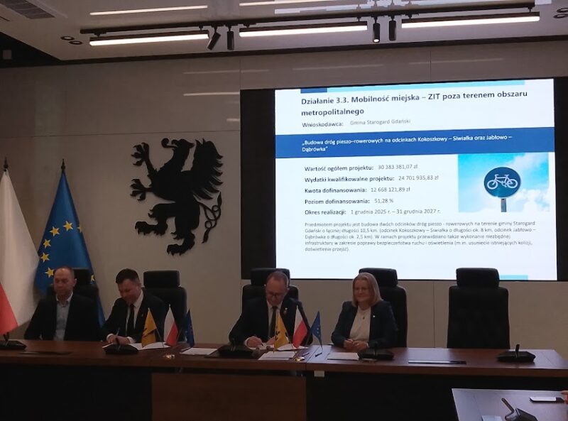 Spotkanie w Gdańsku było również okazją do podpisania kolejnych umów na dofinansowanie konkretnych inwestycji ze środków europejskich. Wsparcie otrzymały trzy samorządy: Malbork, Starogard Gdański oraz Pruszcz Gdański. Wszystkie umowy dotyczą mobilności. W Pruszczu Gdańskim rozbudowany zostanie węzeł integracyjny przy dworcu. Powstanie również nowa kładka nad Radunią, co usprawni pieszym i rowerzystom dojście z centrum miasta do stacji kolejowej. Drogi dla pieszych i rowerów wybudowane zostaną również w Malborku. Prawie 1,2 km traktów połączy istniejące drogi, dzięki czemu powstanie spójna sieć ciągów pieszo-rowerowych. Drugi malborski projekt to zakup czterech zeroemisyjnych autobusów komunikacji miejskiej oraz budowa punktu ich zasilania na zajezdni. Wreszcie, w gminie Starogard Gdańsku wybudowanych zostanie ponad 10 km dróg rowerowych. Połączą one Kokoszkowy z Siwiałką oraz Jabłowo z Dąbrówką. Całkowita wartość dofinansowania podpisanych 1 grudnia 2025 r. umów to ok. 28,5 mln zł – poinformował Michał Piotrowski – rzecznik prasowy, zastępca dyrektora Departamentu Kancelaria Marszałka Województwa Urzędu Marszałkowskiego Województwa Pomorskiego.