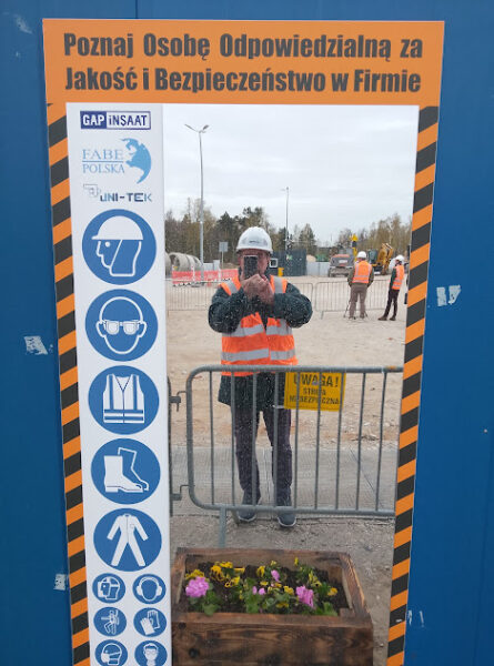 Przed wejściem na plac budowy zostaliśmy wyposażeni w kaski i kamizelki ochronne. Zapoznano nas z zasadami bezpieczeństwa w miejscu wykonywania robót. Staliśmy się niemal specjalistami w tym zakresie i mogliśmy swą osobę, przeszkoloną, zobaczyć na własne oczy: w lustrze.