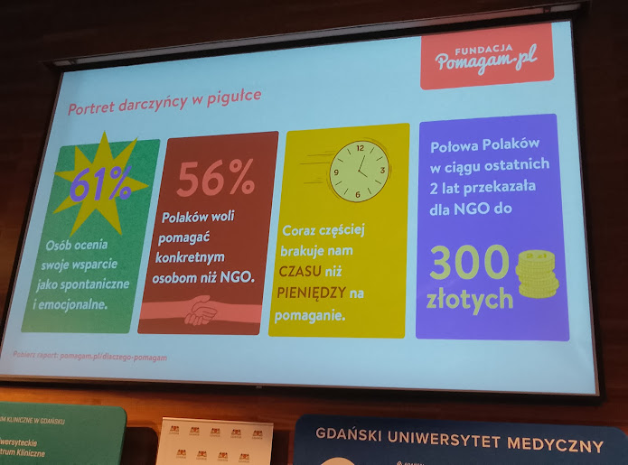 Istotne jest poznanie, w jaki sposób darczyńca wybiera, kogo wesprzeć, zwłaszcza finansowo. O tym mówiła Natalia Zdrojewska z Fundacji Pomagam.pl , przedstawiając raport pt. „Jak i dlaczego pomagam? Portret darczyńcy w Polsce” (https://pomagam.pl/blog/jak-naprawde-pomagaja-polacy-raport )